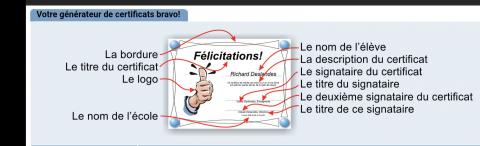 Le générateur de certificats BRAVO est un outil en ligne gratuit permettant aux enseignants de créer et personnaliser des certificats de mérite pour leurs élèves. Il offre la possibilité d’ajouter jusqu’à 35 noms d’élèves, de choisir une bordure, un logo, de rédiger un titre et une description personnalisée, ainsi que d’ajouter deux signatures et le nom de l’école. Ce générateur est conçu pour récompenser les élèves pour leur comportement, leur attitude ou leurs réalisations exceptionnelles en classe.