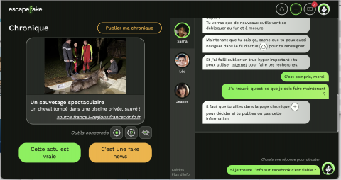 Escape Fake (jeu.escape-fake.fr) est un escape game en ligne dédié à l’éducation aux médias. Le/la joueur·euse crée un avatar et rejoint, en tant que stagiaire, la rédaction du Vrai Journal. Sa mission : vérifier des informations reçues via réseaux sociaux, e-mails ou messageries, puis décider si elles sont fiables et associer la bonne légende à l’illustration correspondante. Le tout se déroule sous contrainte de temps, avec un objectif de publication d’une chronique de cinq informations vérifiées