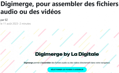 Digimerge est une application en ligne qui permet de regrouper plusieurs fichiers audio (.mp3, .wav, .m4a, .ogg, .flac, .aac) ou plusieurs vidéos (.webm, .ogm, .mp4, .m4v, .mov, .mkv) en un seul fichier, de manière simple et rapide.