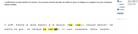 Partagée le 19.05.25 à 13:58 - Mise à jour le 19.05.25 à 14:11 Il suffit d'écire le texte destiné à la lecture. Vous pouvez ensuite décider de mettre en gras, en italique ou souligner les sons complexes et les lettres muettes.