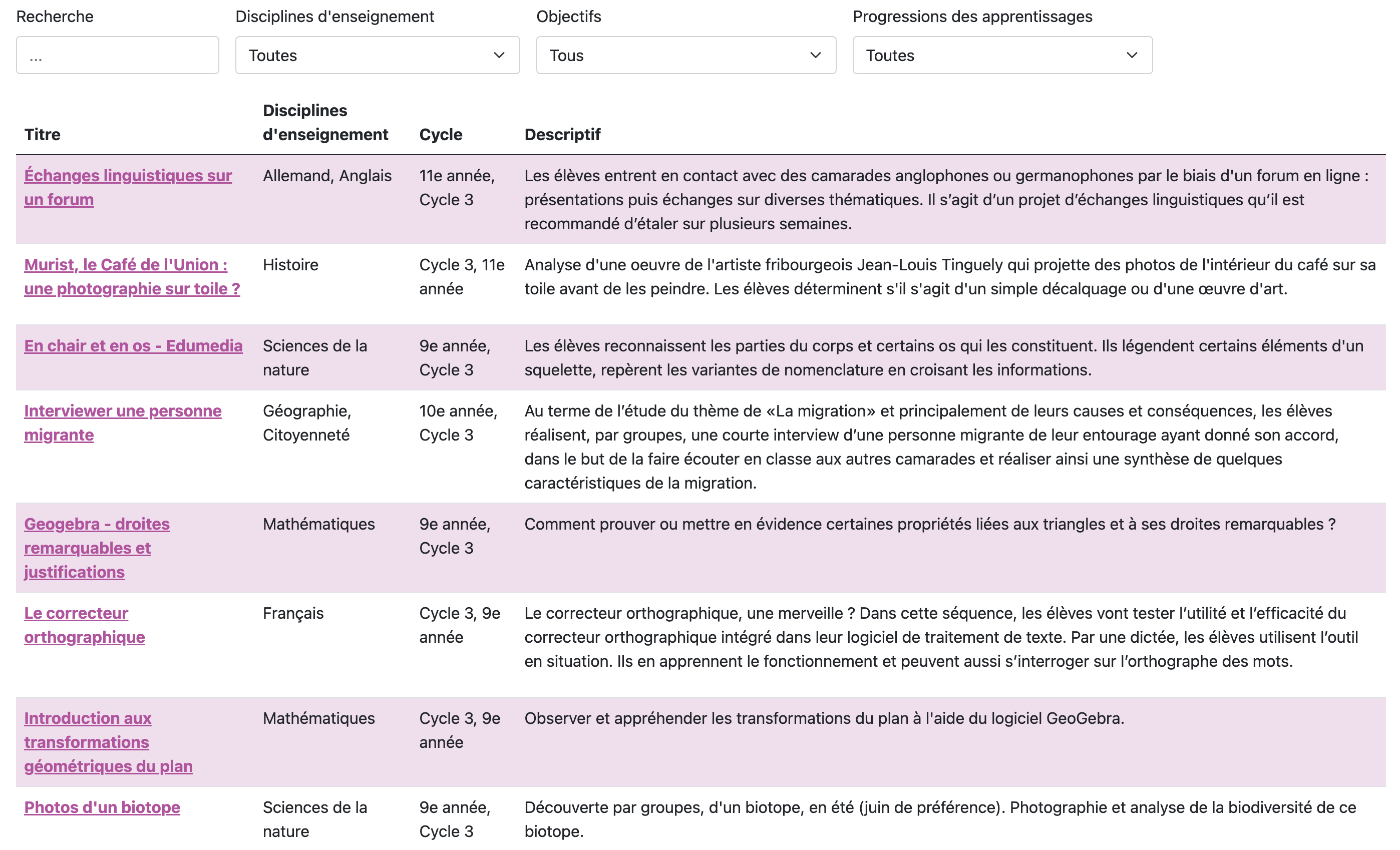 NouveauPerEdNum, via Friportail (cantons romands), propose des séquences pédagogiques pour le cycle 3 (9H-11H), intégrant l’éducation numérique dans diverses disciplines (français, sciences, géographie, histoire, musique, éducation physique…). Chaque séquence propose des objectifs clairs, des activités (...)