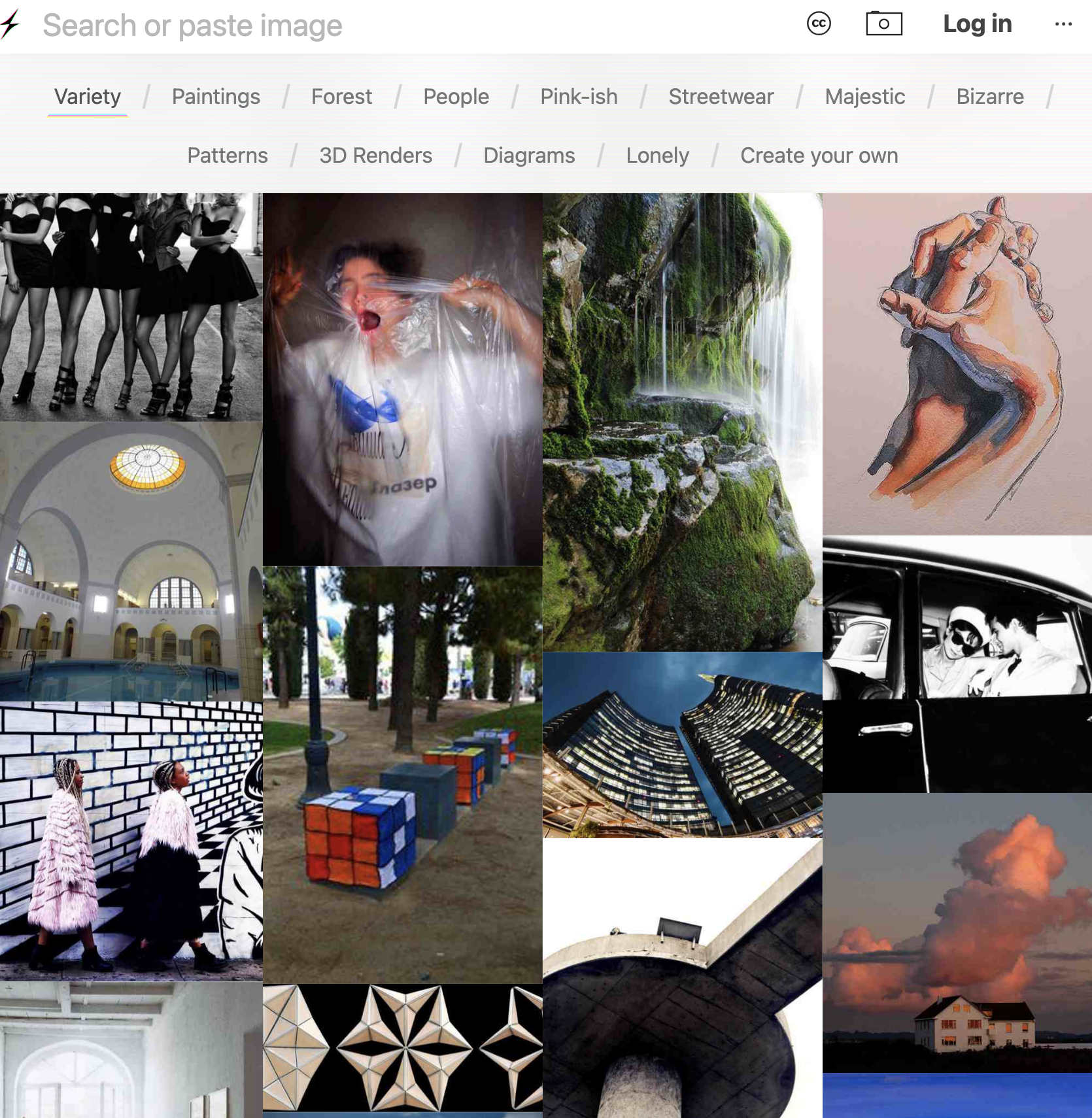 NouveauSite pour trouver des références similaires pour créer un moodboard par exemple. Il est possible d'importer des images ou de se baser sur la base de données. Les différents styles sont par exemple : peintures, forêts, personnes, streatwear, majestueux, bizarre, paternes, 3D, diagrammes. Peut être (...)
