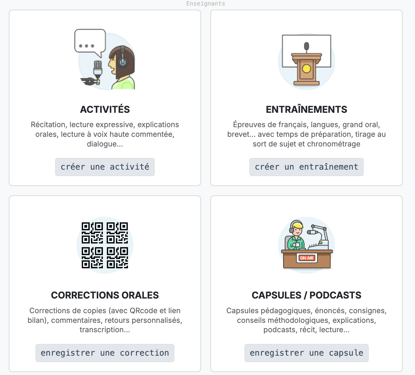 NouveauPour enregistrer des retours et corrections par oral pour les élèves. On peut créer une classe. Chaque élève se voit attribuer un QR code et il suffit de rajouter un enregistrement directement dans la section de l'élève concerné. L'audio peut durer jusqu'à 10 minutes. Ce site est RGPD donc (...)