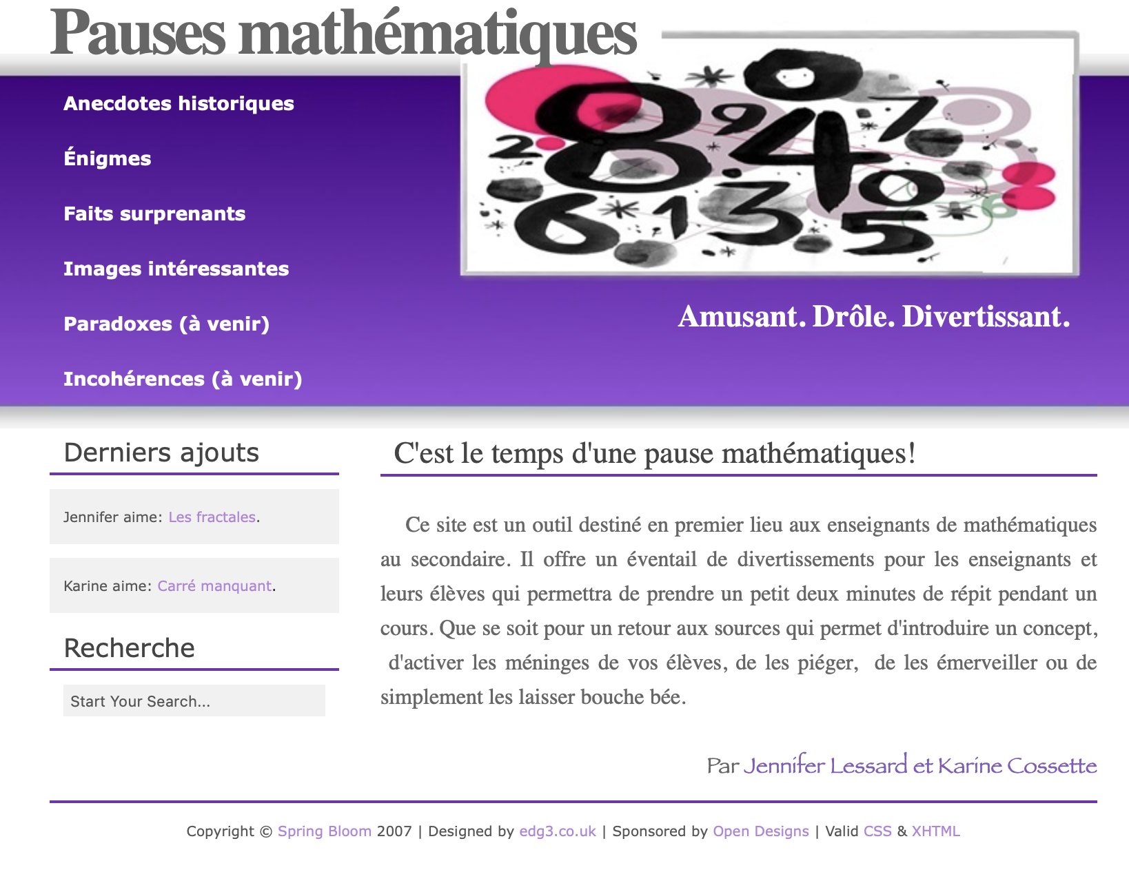 Ce site est un outil destiné en premier lieu aux enseignants de mathématiques au secondaire. Il offre un éventail de divertissements pour les enseignants et leurs élèves qui permettra de prendre un petit deux minutes de répit pendant un cours. Que se soit pour un retour aux sources qui permet d (...)