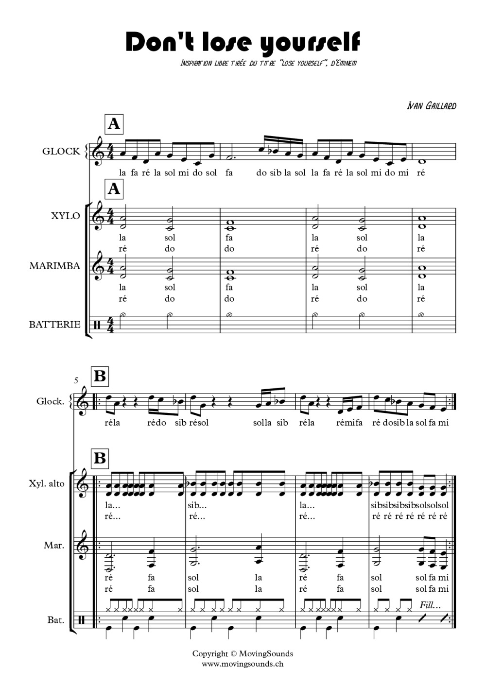 Arrangement pour glockenspiel, xylo alto, marimba basse et batterie. Inspiration libre tirée du titre "Lose yourself", d'Eminem. Le but est que les élèves arrangent eux-même la pièce en choisissant dans quel ordre faire les 4 phrases du morceau, combien de fois les jouer, ou encore quel instrument (...)Lire la suite