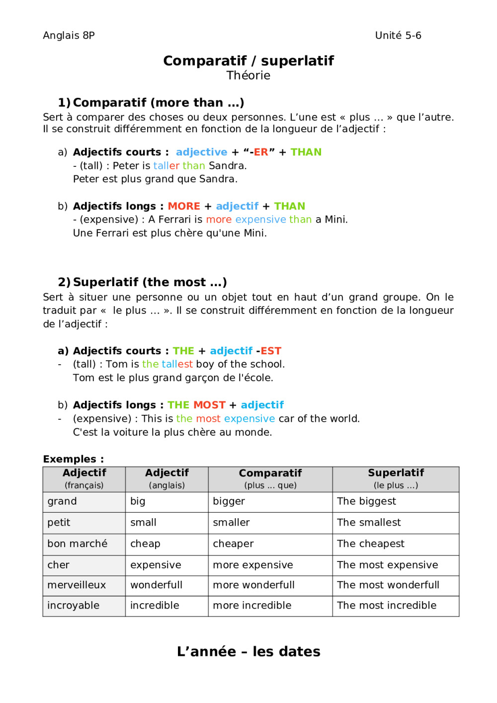 Théories pour quelques points des unités 5 et 6. Comporte : Comparatif/superlatif L'année / les dates (nombres ordinaux, jours de la semaine, mois, saisons, fêtes) L'auxiliaire "would" pour former le conditionnel (demande polie)Lire la suite