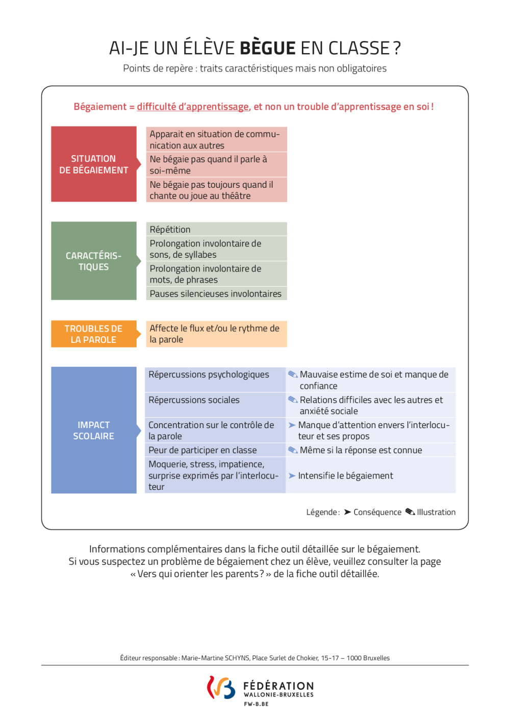 Voici 2 documents très intéressants concernant le BEGAIEMENT (le bégaiement n’est pas considéré comme un trouble d’apprentissage en tant que tel mais il peut être un frein, une difficulté dans l’apprentissage durant la scolarité), réalisés par la Fédération Wallone de Bruxelles qui nous a très généreusement permis d'utiliser directement les PDF.