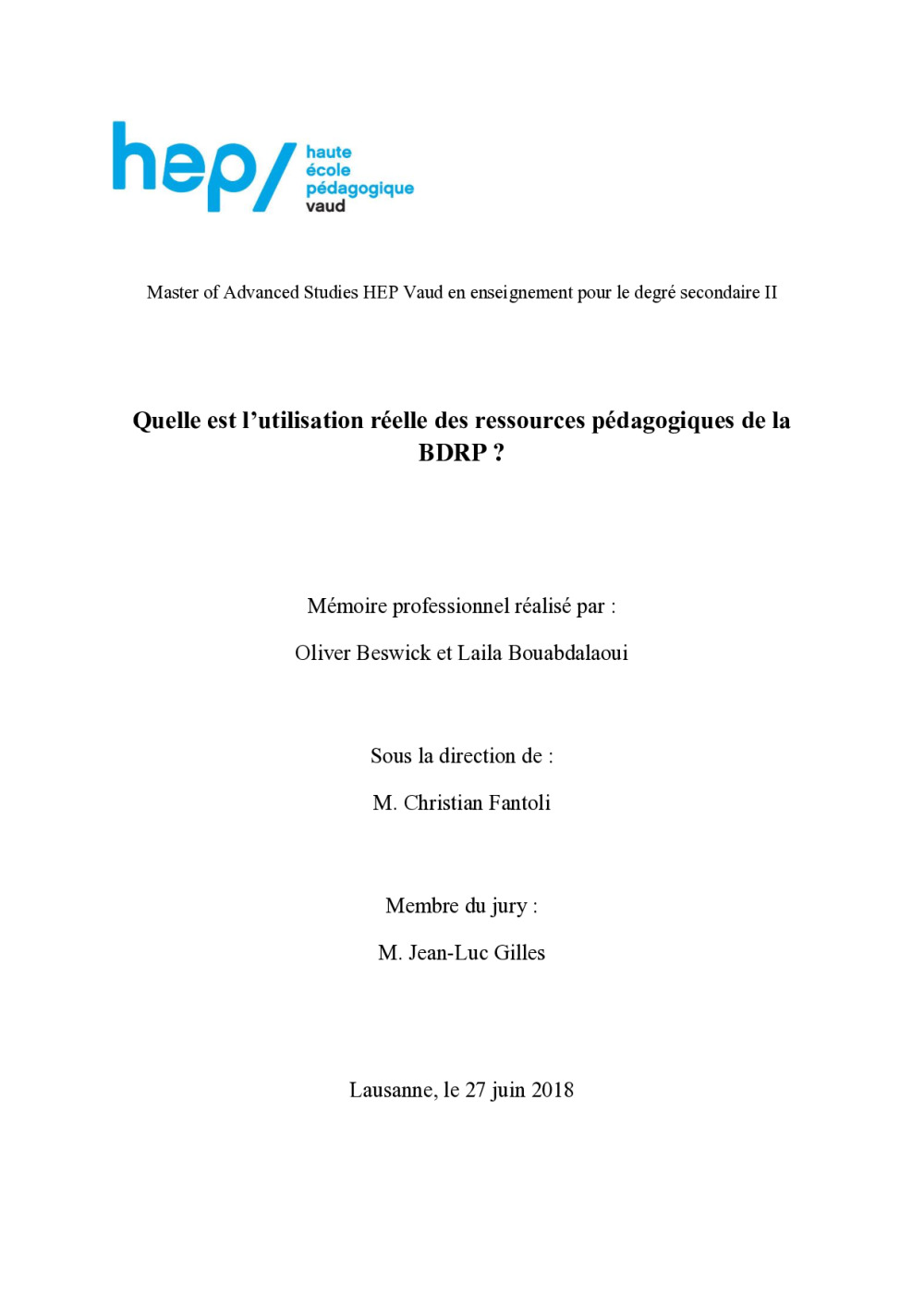 Ce travail réalisé par Oliver Beswick et Laila Bouabdalaoui a pour but de comprendre le mode d'utilisation des ressources pédagogiques par les utilisateurs (enseignants vaudois) de la banque de ressources pédagogiques (BDRP).