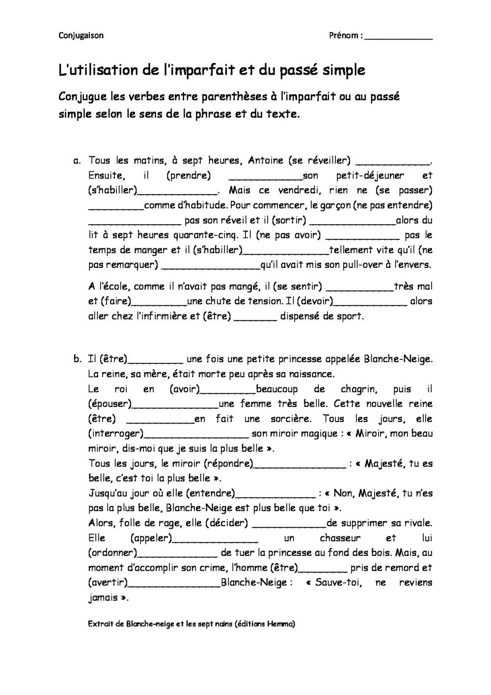 Dans cette fiche, les élèves complètent les lacunes en conjugant les verbes soit au passé simple soit à l'imparfait selon le sens du texte,