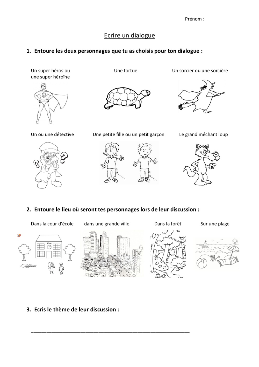 Fiche “de choix“ pour les élèves. Leur permet de choisir les personnages, le lieu et le sujet du dialogue qu'ils vont écrire. Permet de travailler la forme du dialogue écrit, ainsi que l'imagination et la composition libre. Testé en stage avec une classe de 6P. Les images sur la fiche proviennent (...)Lire la suite