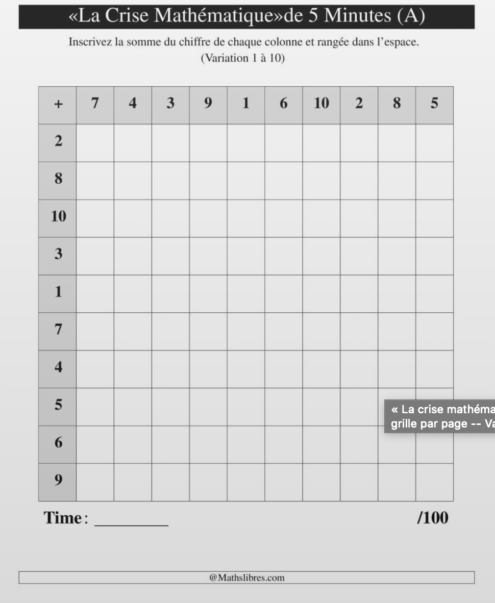 Feuille d'exercices à faire en commun. Additions (association selon compléments à 10 et à 100) et multiplications. Note BDRP : une version PDF a été ajoutée.Lire la suite
