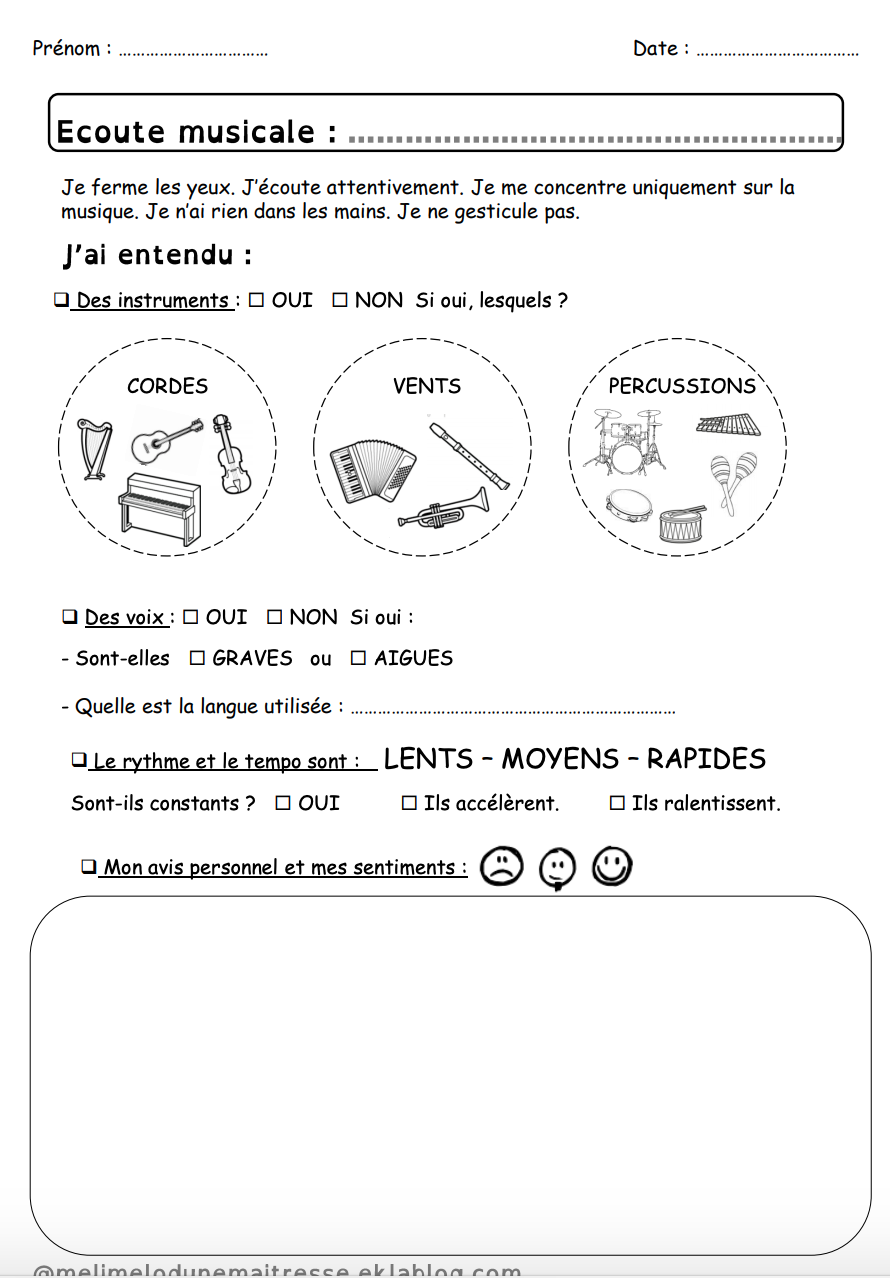 Super document à remplir par les élèves pour pratiquer l'écoute musicale ! Découvert sur le blog de Méli-Mélo d'une maîtresseLire la suite