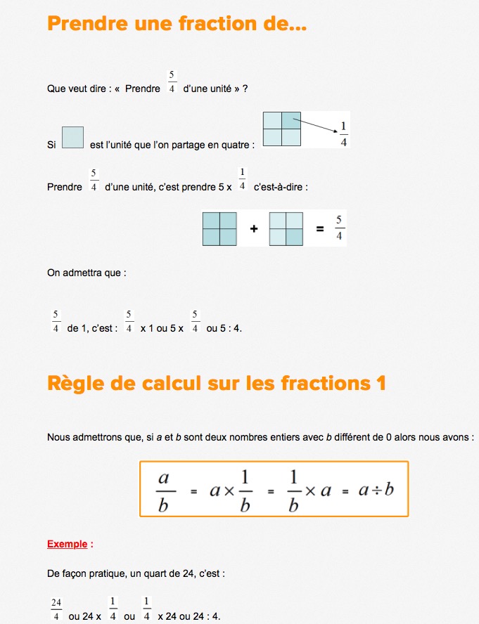 Un petit résumé sur les fractions qui facilitera l'apprentissage de la résolution d'équation du premier degré (ma fille est en 10e H ;-)... Repéré une petite erreur : Il est écrit: 5/4 de 1, c’est : 5/4 x 1 ou 5 x 5 /4 ou 5 : 4. Il faudrait plutôt écrire: 5/4 de 1, c’est : 5/4 x 1 ou 5 x 1 /4 ou 5 (...)Lire la suite