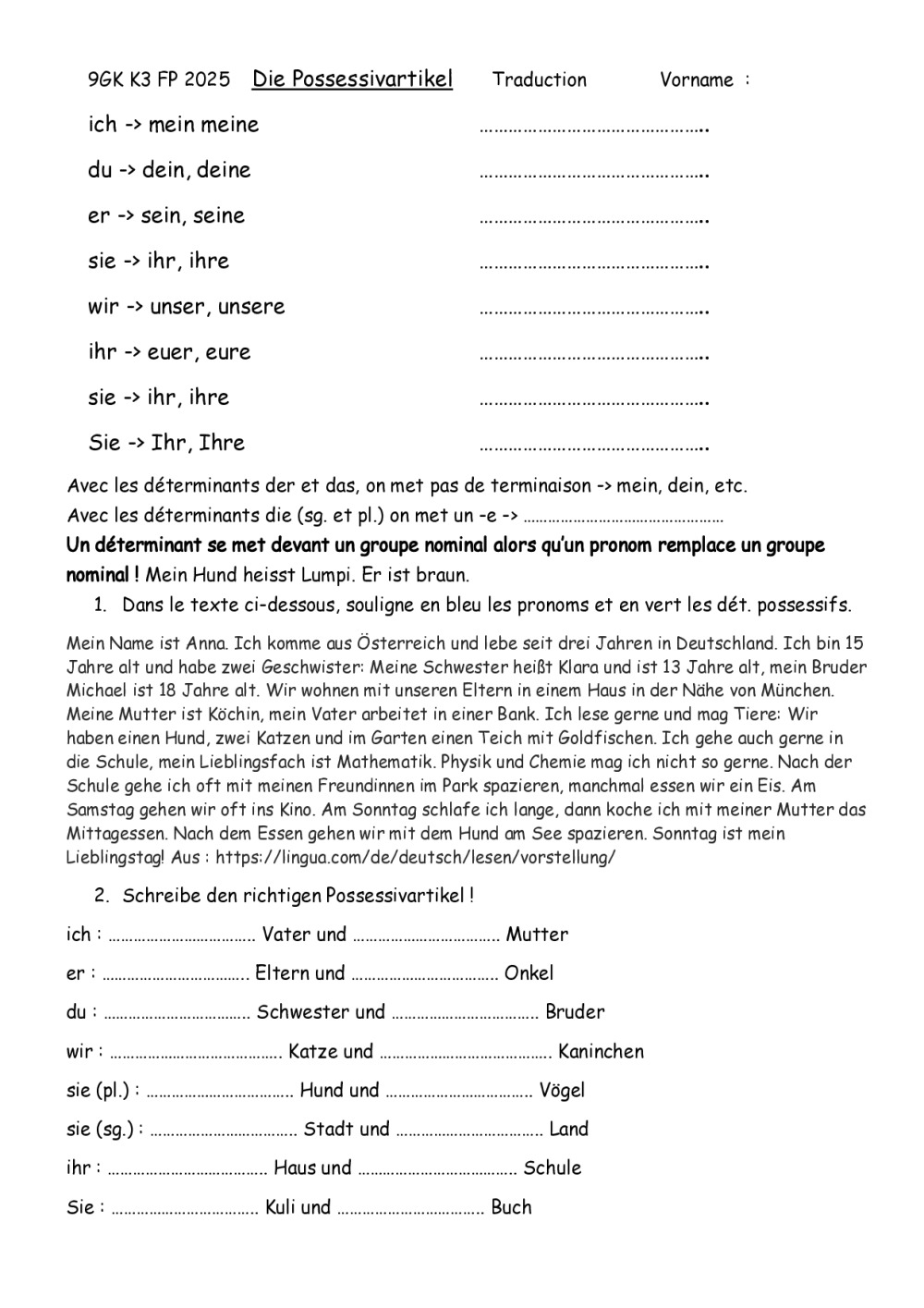 Résumé de grammaire des chapitres 1-3 de GenialKlick 9e. Place du verbe, Conjugaison présent, pronoms, déterminants possessifs, prépositions et cas.
