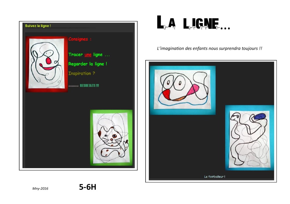 Consigne : - Fais ton dessin sans jamais lever ta plume du papier, puis colorie-le. Dessin d'un seul jet !! Donc utiliser feutre noir fin ou plume. Il ne faut pas devoir repasser sur les traits, on doit voir "les chemins" !! Moment sympa et certains enfants ont de belles idées. Contenu : 2 exemples (...)Lire la suite