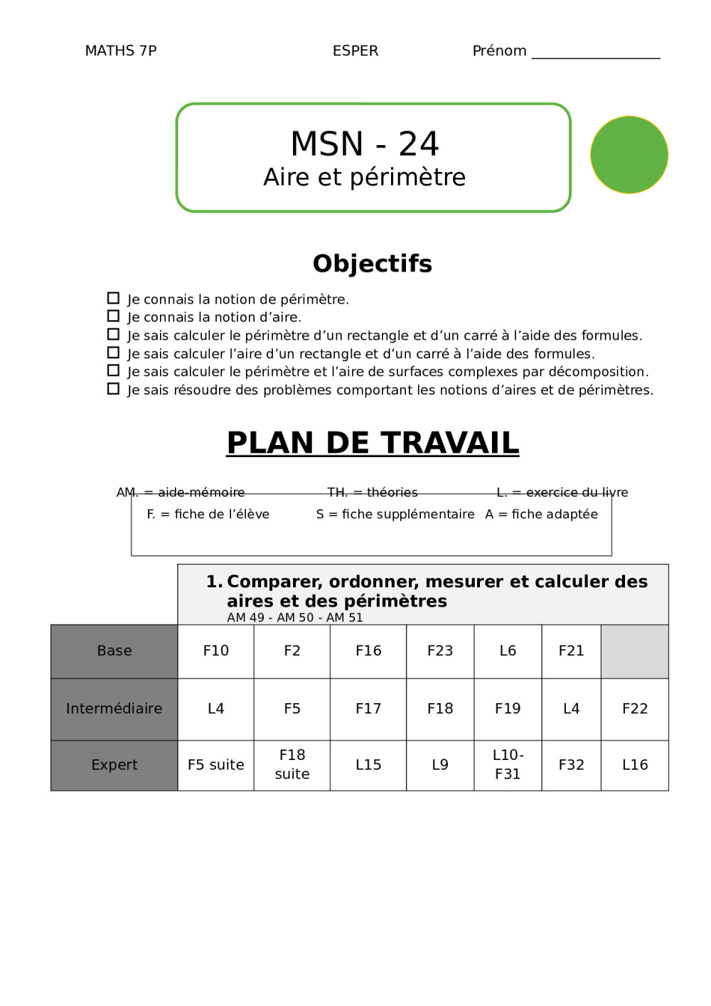 Plan de travail sur l'aire et le périmètre, basé sur les MER (ESPER).Lire la suite