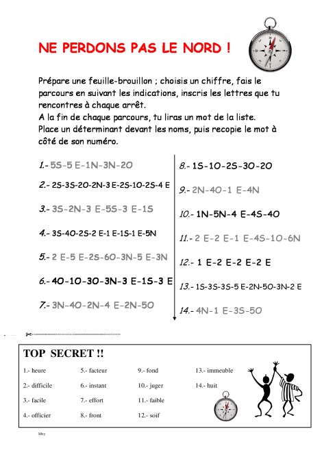 14 mots à reconstituer en se déplaçant dans un tableau. Décoder les chemins proposés en utilisant les points cardinaux. 1 fiche (excel) avec tableau et case-réponses 1 fiche (word) avec parcours codés et TOP SECRET. (Ne pas oublier de découper le TOP SECRET avant distribution !!)Lire la suite