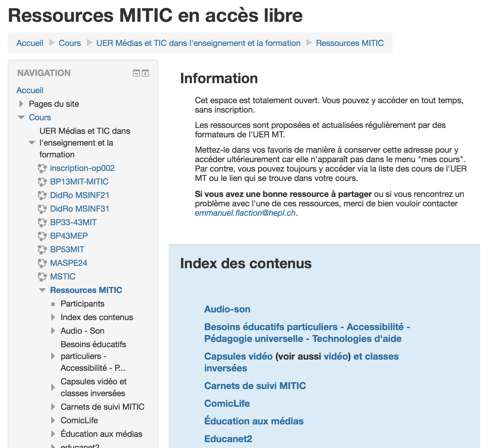 Ressources MITIC proposés par les formateurs HEP du cours BP Index des contenus: Audio-son Besoins éducatifs particuliers - Accessibilité - Pédagogie universelle - Technologies d'aide Capsules vidéo (voir aussi vidéo) et classes inversées Carnets de suivi MITIC ComicLife Éducation aux médias (...)Lire la suite