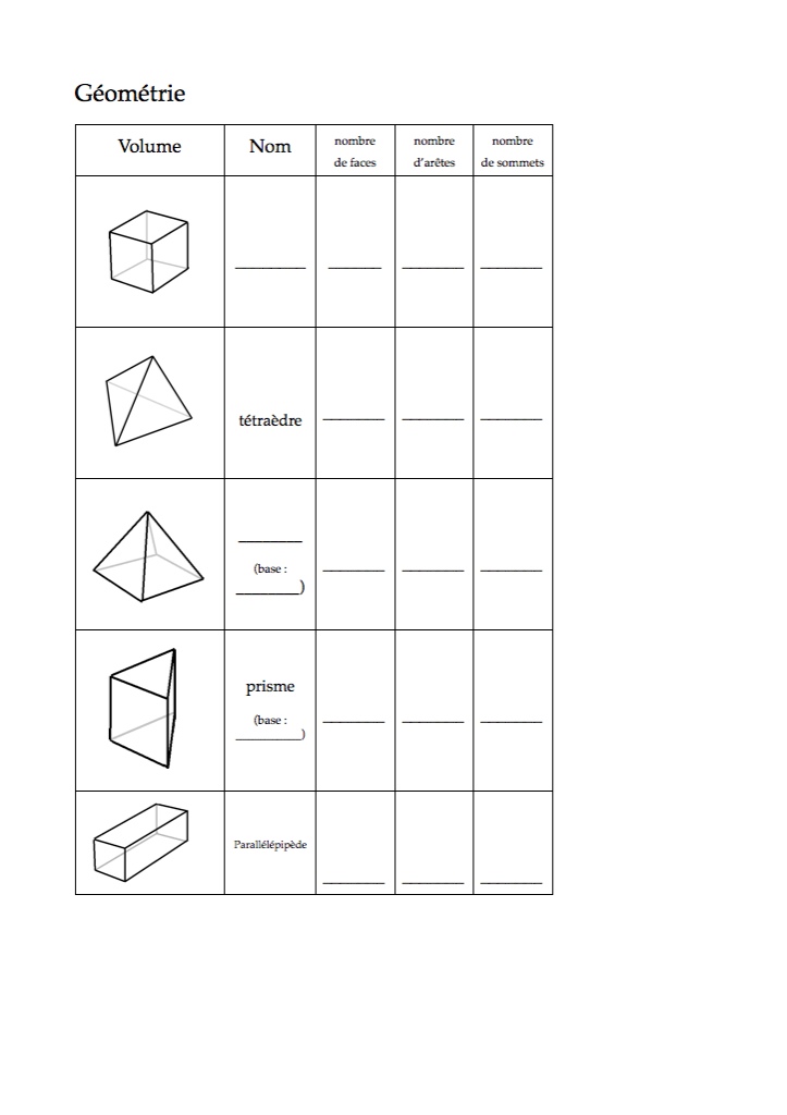 Solides : doc 1 : grille à compléter avec les noms des solides, nombre d'arêtes, de faces, de sommets. doc 2 : classer des solides doc 3 : reconnaître et colorier des solides doc 4 : reconnaître et colorier des solides doc 5 : reconnaître et colorier des solides - questions VRAI FAUXLire la suite