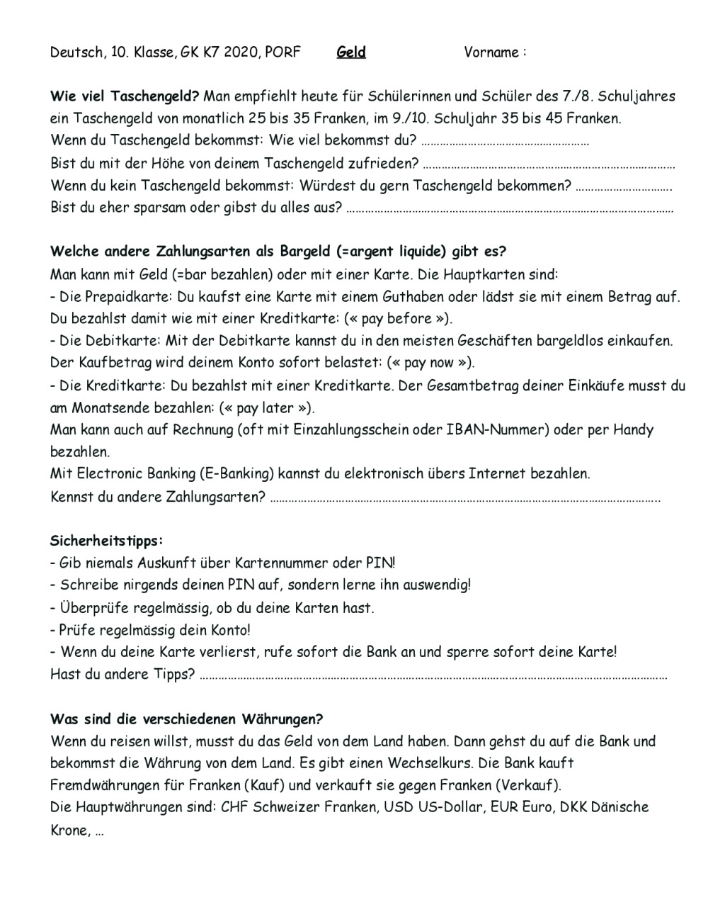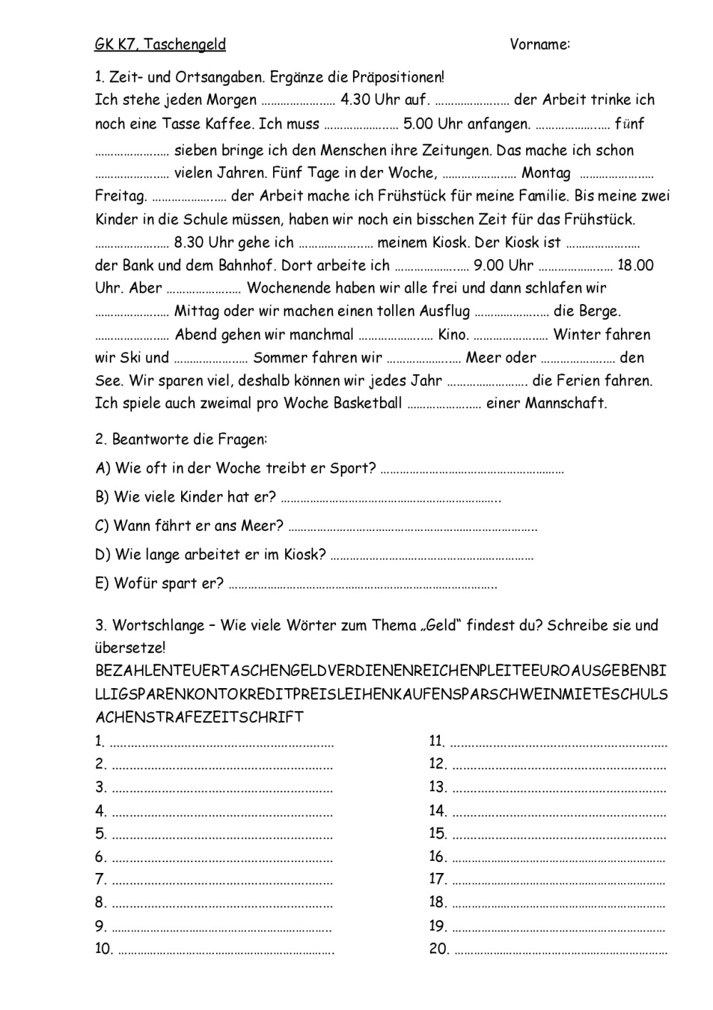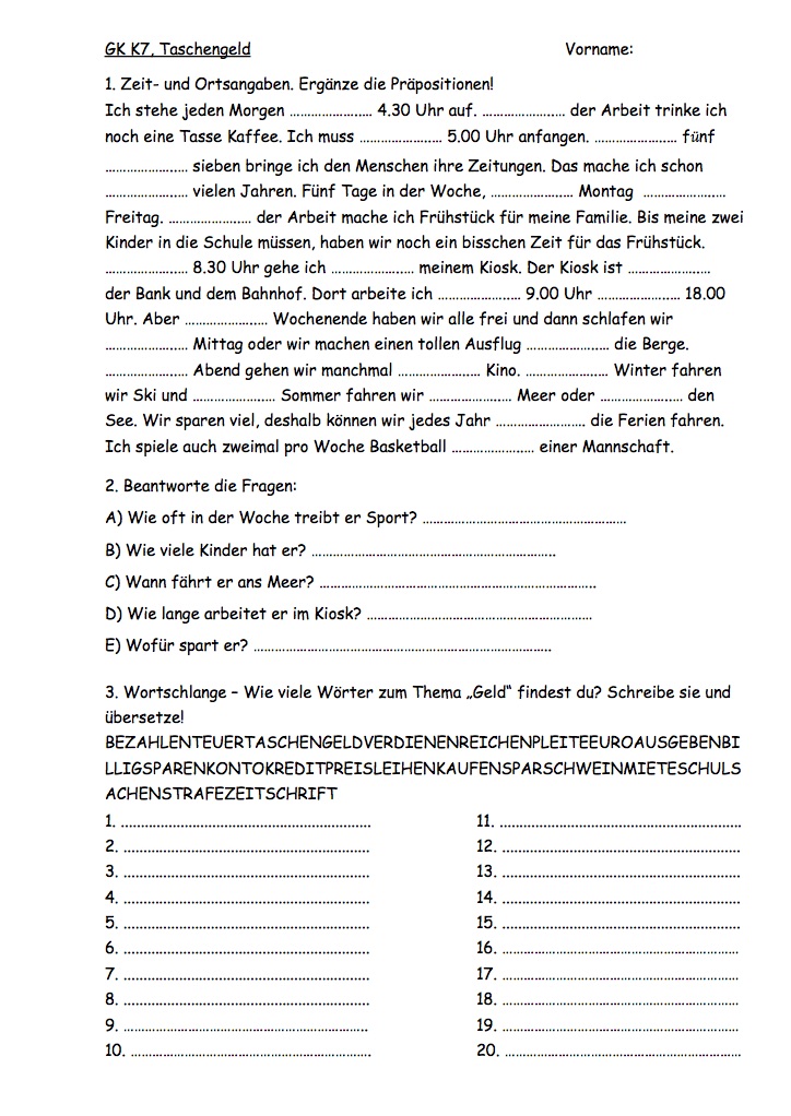 10GK K7 TS et exercice sur "Taschengeld, Hobbys, ... "+ Mots cachés