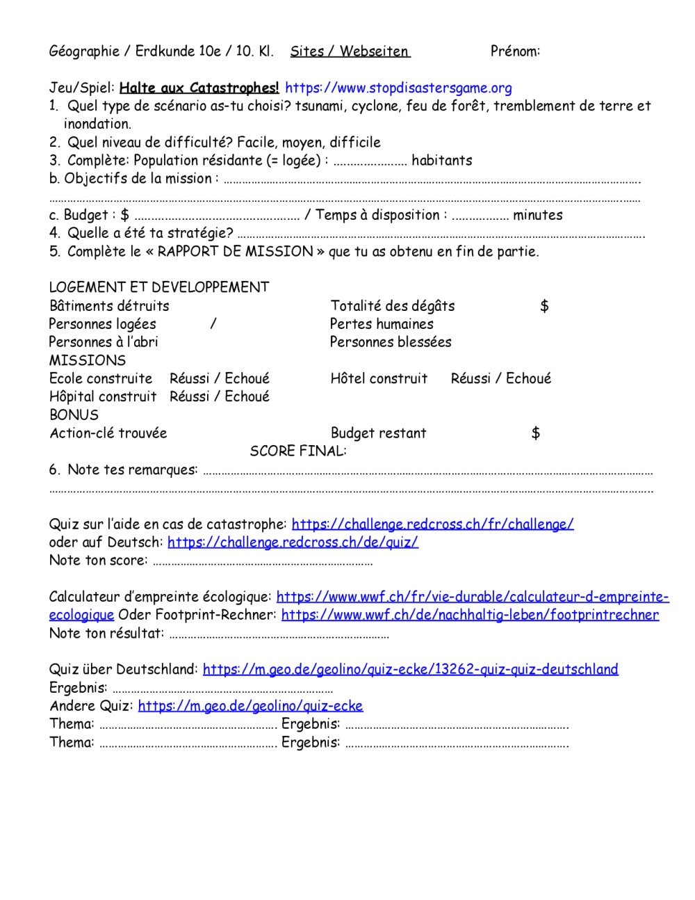 9-10 géo, fiche avec des liens pour des jeux en ligne sur les catastrophes naturelles, l'empreinte écologique, des quizz
