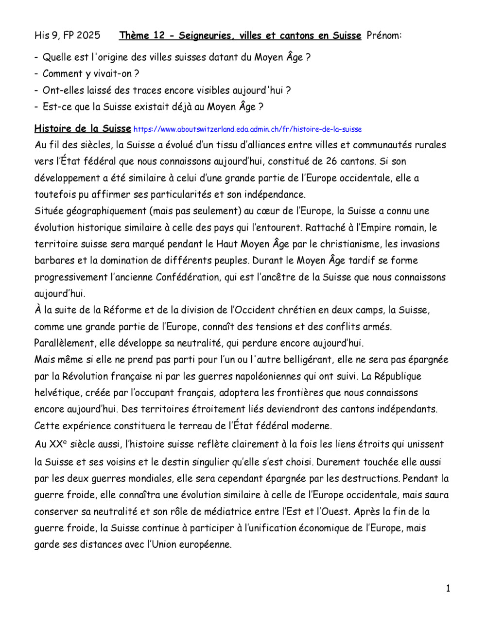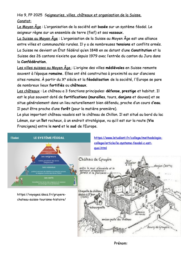 9 histoire, th. 12, Seigneuries, villes et cantons en CH, châteaux et panneau/powerpoint