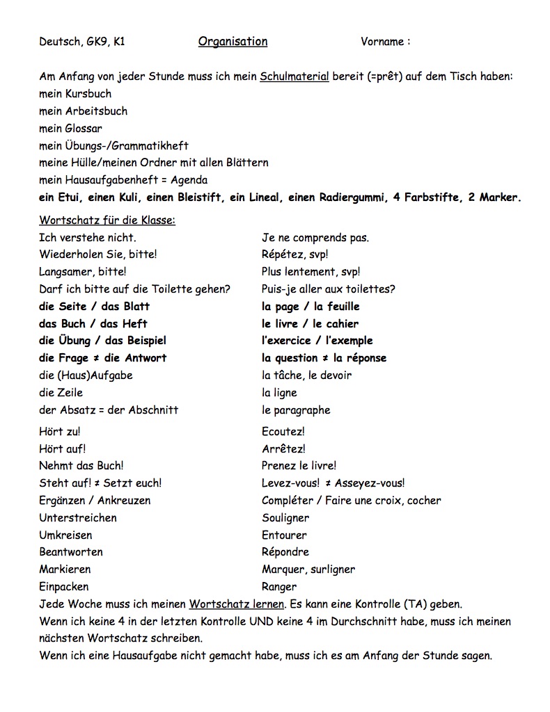 9GK K0 allemand, début d'année, Deutsch, Jahresanfang, Organisation, Unterrichtssprache, Uhrzeiten