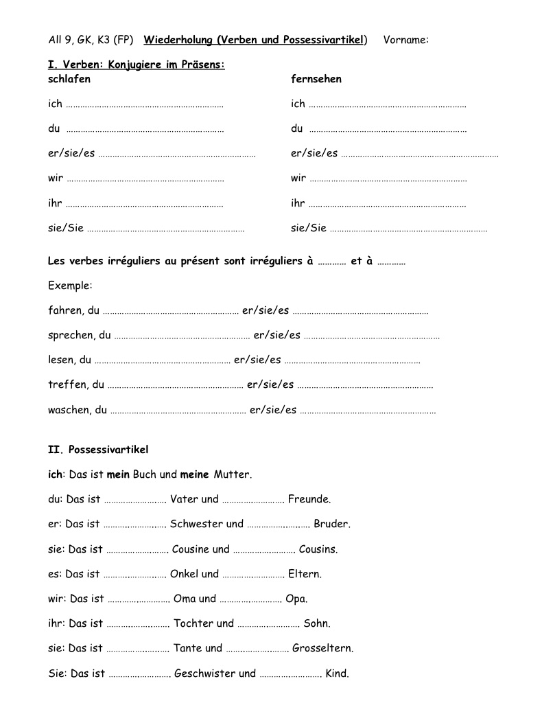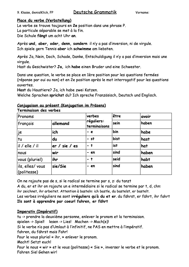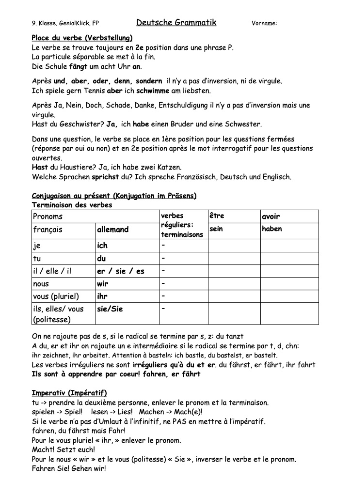 Résumé de grammaire des chapitres 1-3 de GenialKlick 9e. Place du verbe, Conjugaison présent, pronoms, déterminants possessifs, prépositions et cas.