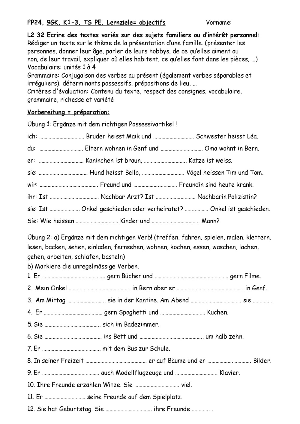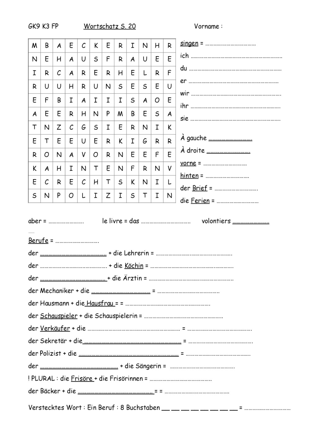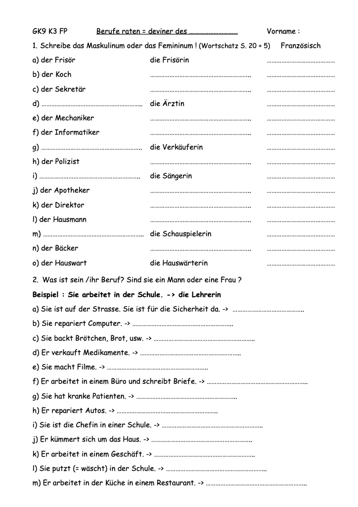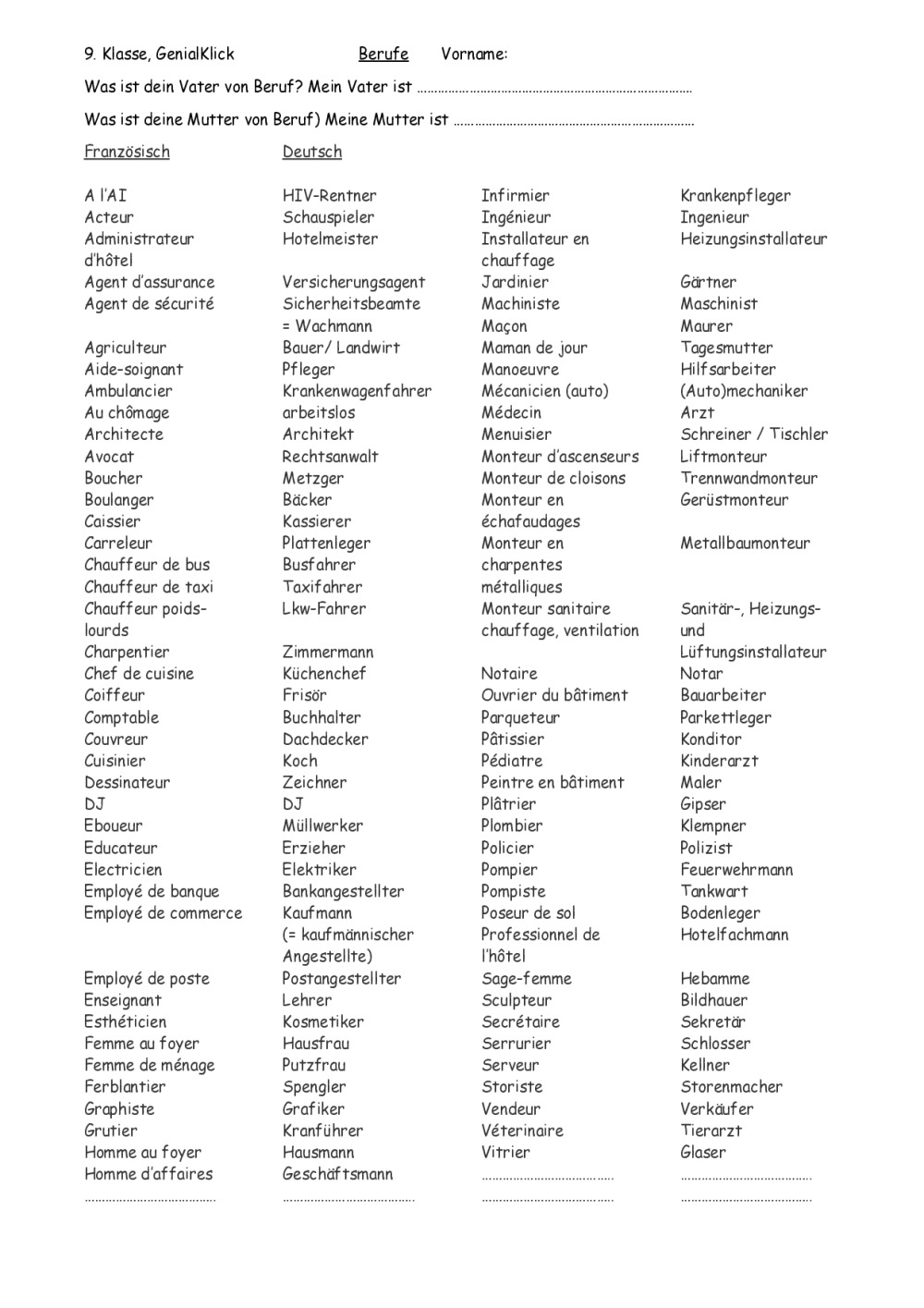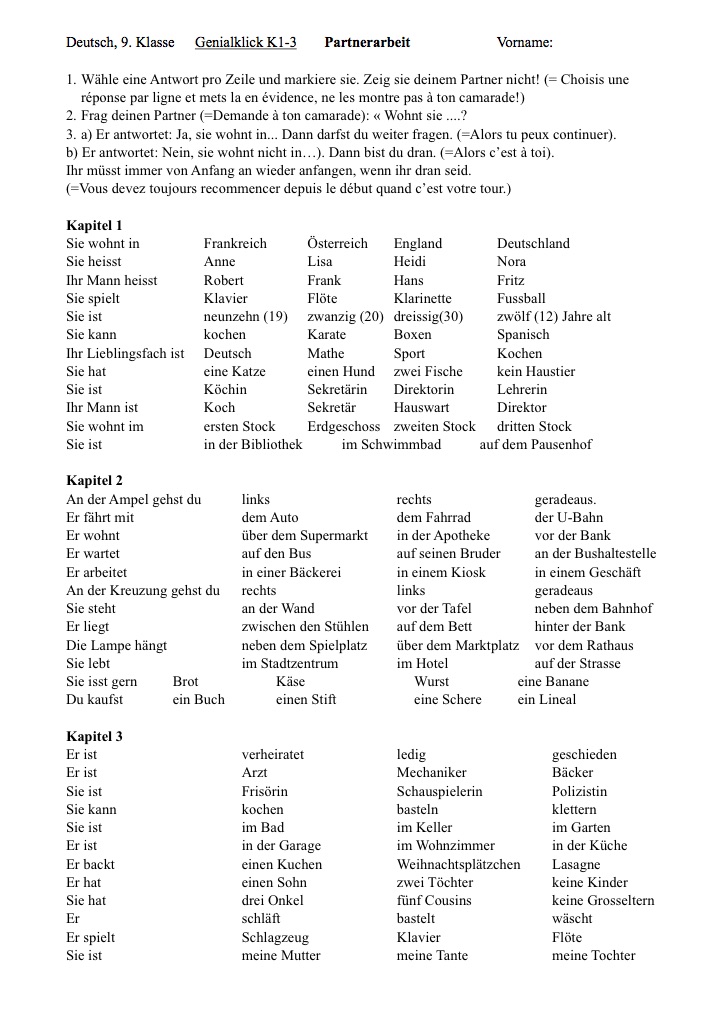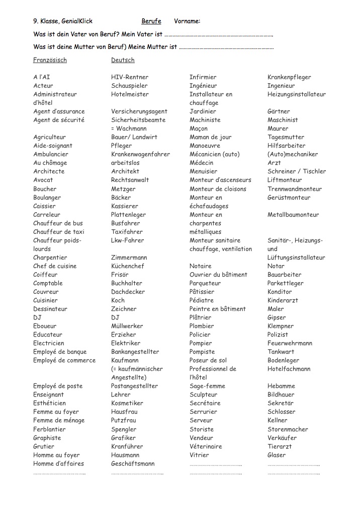 9GK K3 Grammatik: présent, impératif, place du verbe, pronoms, dét poss, cas: NAD, Partnerarbeit, Berufsliste