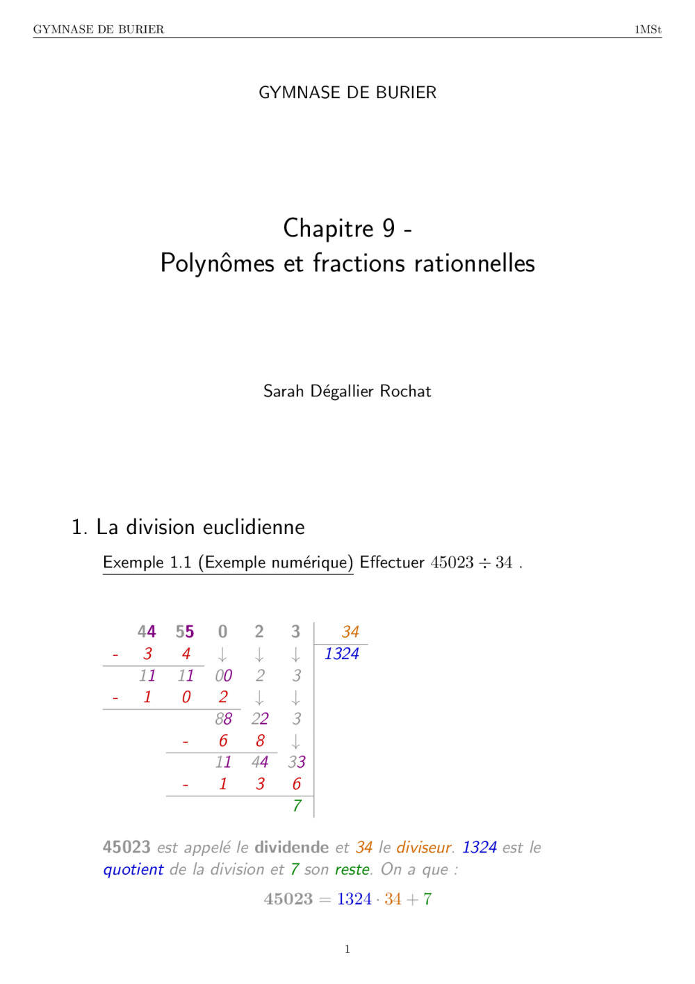 Algèbre (1Mst) : Division polynomiale et fractions rationnelles - Cours - Sarah Rochat