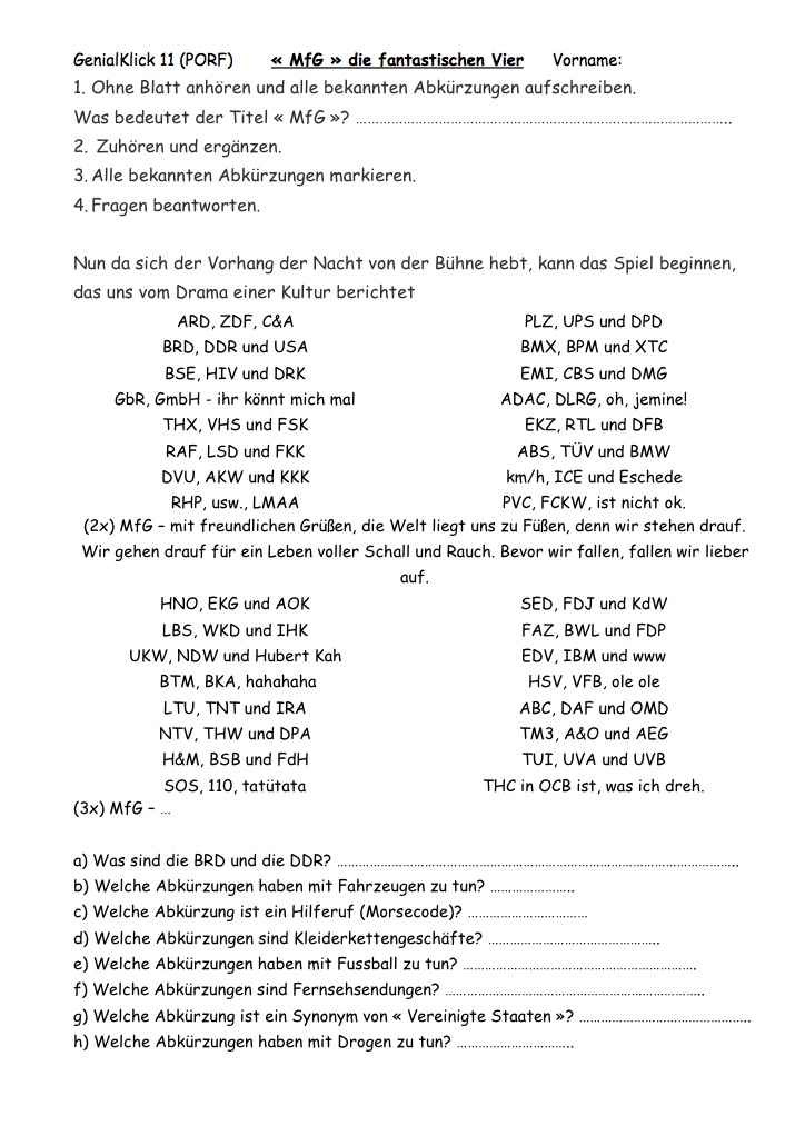 Lied von "die fantsatischen Vier": "MfG" avec toutes les abréviations et ce qu'elles signifient pour l'enseignant. Wichtige Abkürzungen