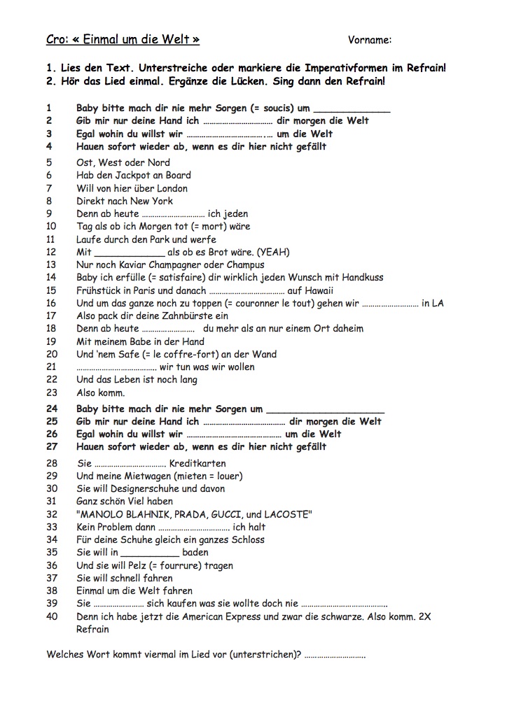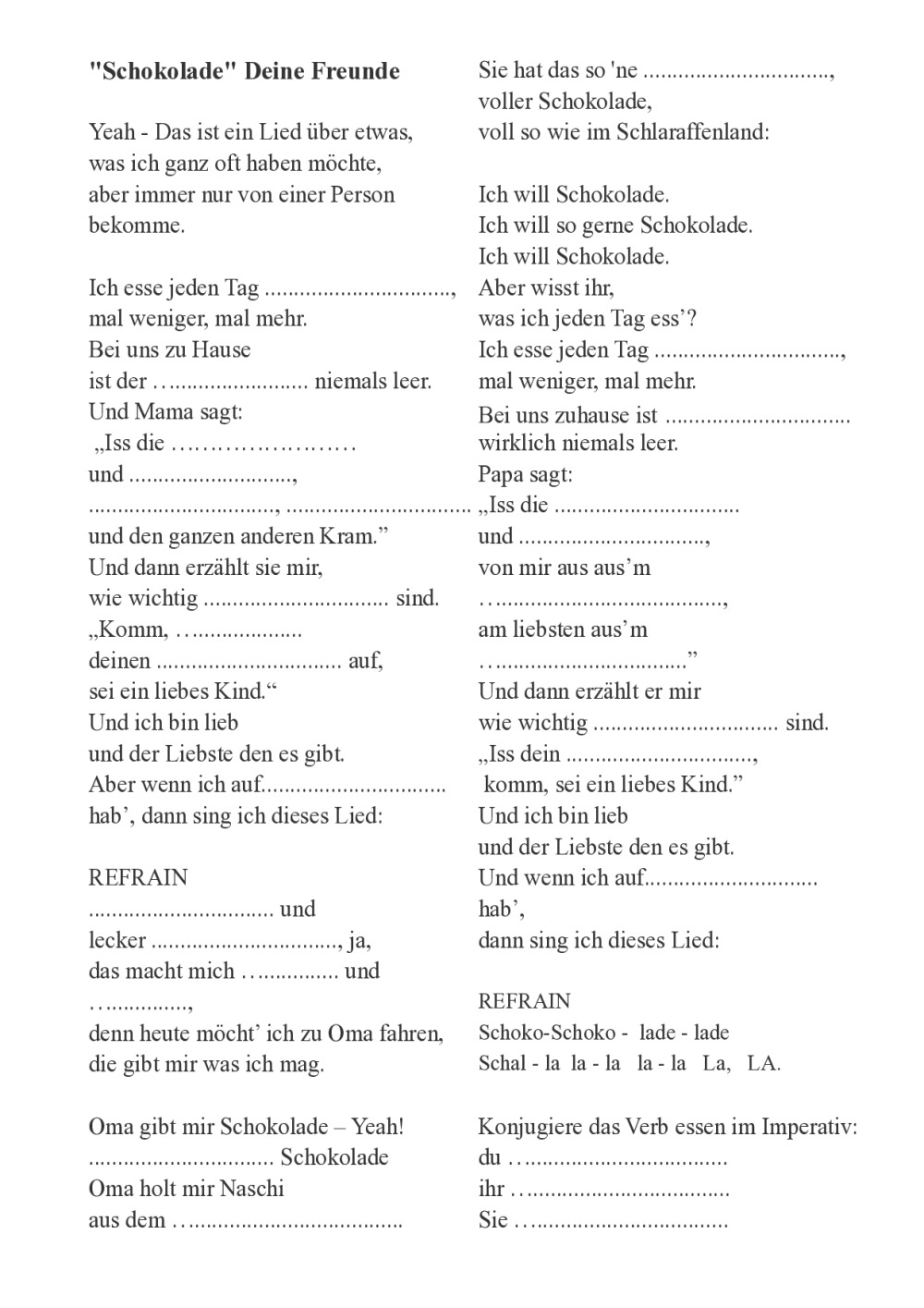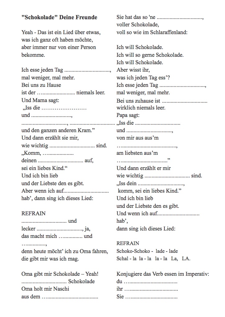 Chanson, thème Essen, Schokolade avec texte à trou, texte entier et corrigé. Peut être écouté de la 5e à la 11e suivant les exercices qu'on fait ou si on distribue la fiche corrigée. 2 versions: une facile ou il faut marquer les mots en rapport avec le thème. Une plus difficile où il faut compléter les lacunes.