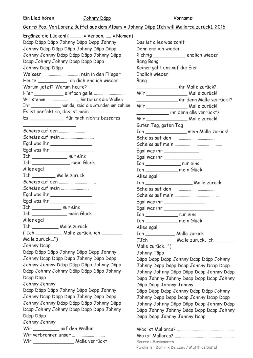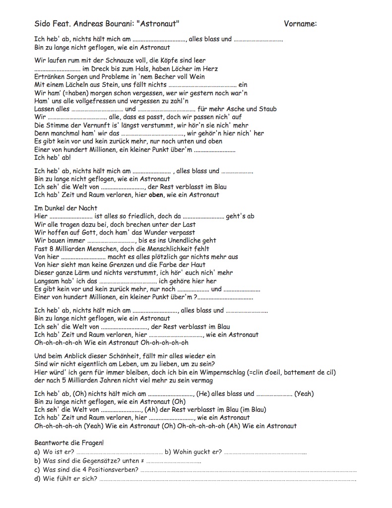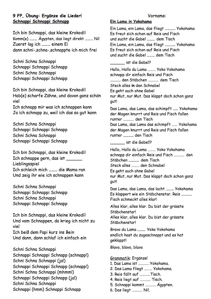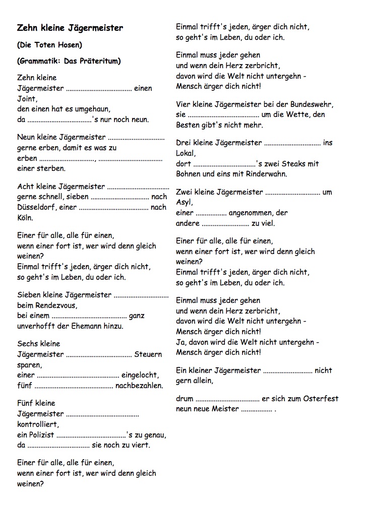 Allemand: LIEDER: "MfG", Schnappi, Lama, Einmal um die Welt, Traum, 10 kleine Jägermeister, Schokolade, Astronaut