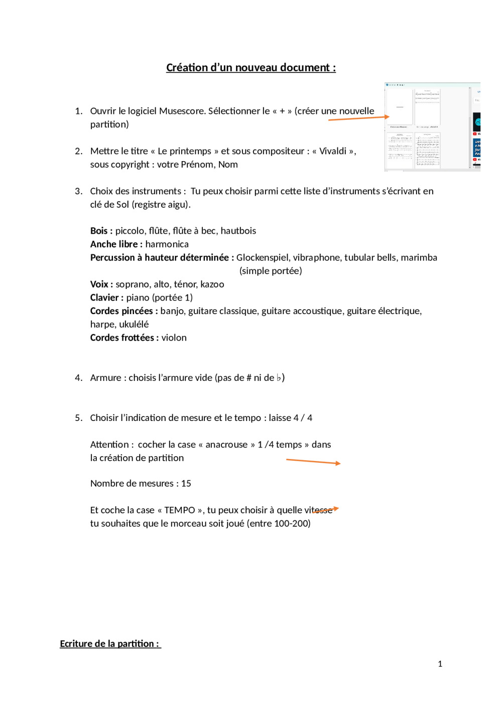 But de l’activité : Les élèves devront écrire une partition du thème « le printemps » de Vivaldi, avec le logiciel Musescore. Cette mélodie aura été apprise préalablement avec la solmisation. Les élèves devront respecter les notes et le rythme du thème, mais ils auront une liberté dans les choix de composition: ils pourront choisir l'instrumentation, le tempo, l'ajout d'un accompagnement, des indications d'interprétations etc.