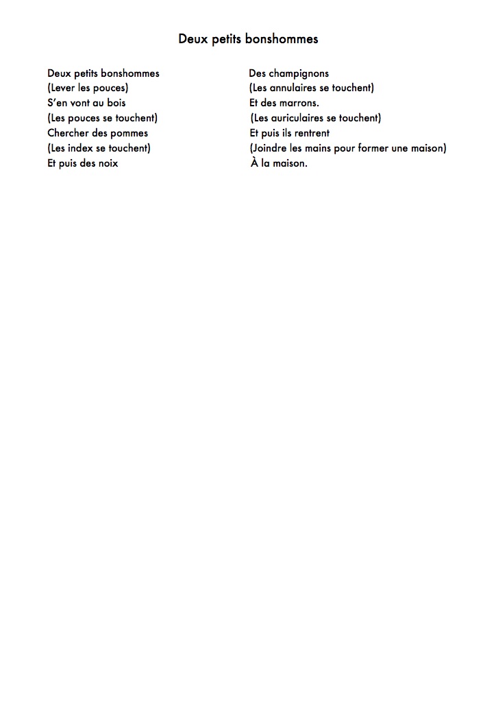 Quelques idées : Pour introduire cette poésie, j'ai montré un panier avec tout ce que les bonshommes ont récolté (champignon, pomme, marron, noix). Les enfants ont nommé les objets et ont expliqué où ils auraient pu trouver tout ça (par exemple dans les bois, dans les magasins, chez eux, etc.). / Pour dire la comptine, s’aider des objets disposés dans l’ordre par terre, que l’on enlèvera petit à petit. / Nous avons dit la comptine avec différentes voix, émotions (voix d'ogre, de souris, d'une voix fachée,...) les enfants avaient plein d'idées et cela les a motivé à répéter la comptine plusieurs fois.