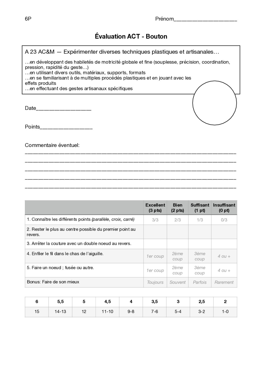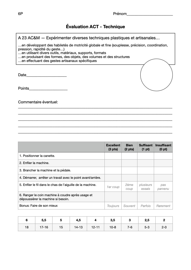 Deux évaluations d'ACT pour les 6ème. Mon but étant avant tout que les élèves prennent du plaisir dans cette branche. Ainsi les évaluations sont légères et visent une toute petite partie de leur ouvrage.