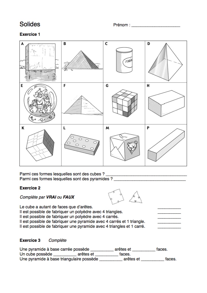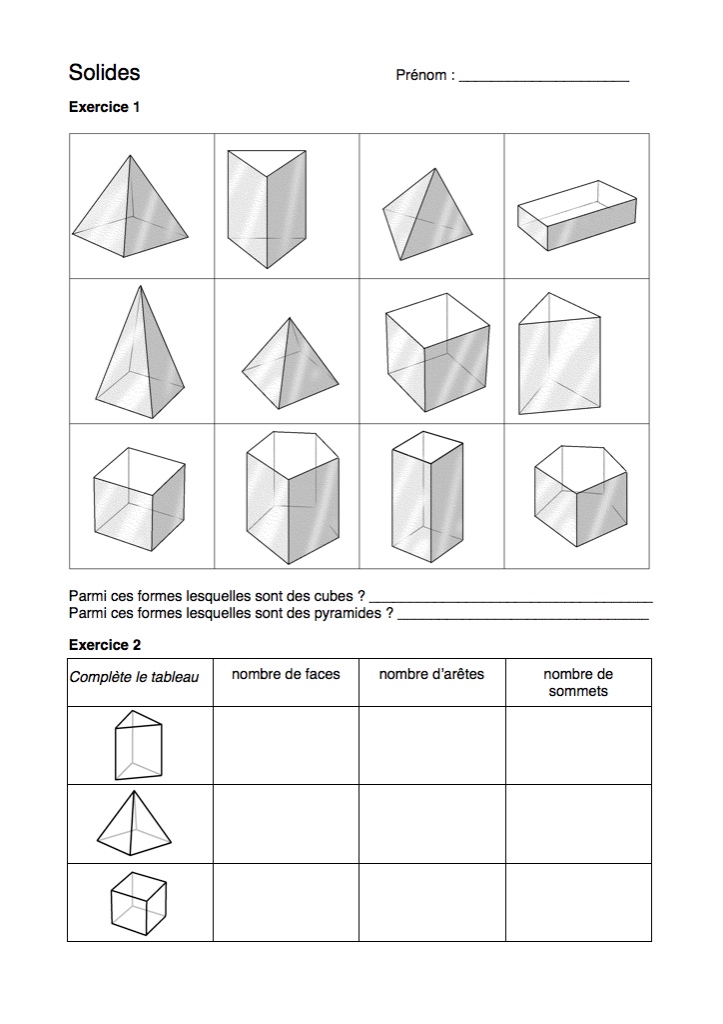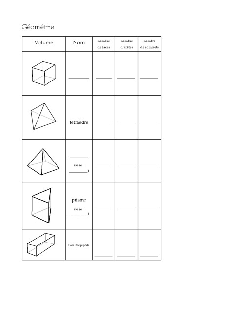 doc 1 : grille à compléter avec les noms des solides, nombre d'arêtes, de faces, de sommets.