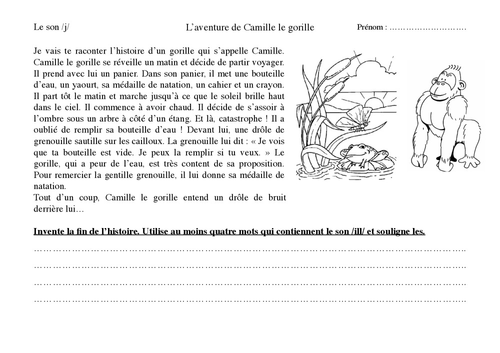 C'est une fiche contenant une histoire que j'ai inventé avec le plus de mots possible contenant le son /ill/. Les élèves doivent inventer la fin de l'histoire en utilisant au moins 4 mots qui contiennent le son /ill/.