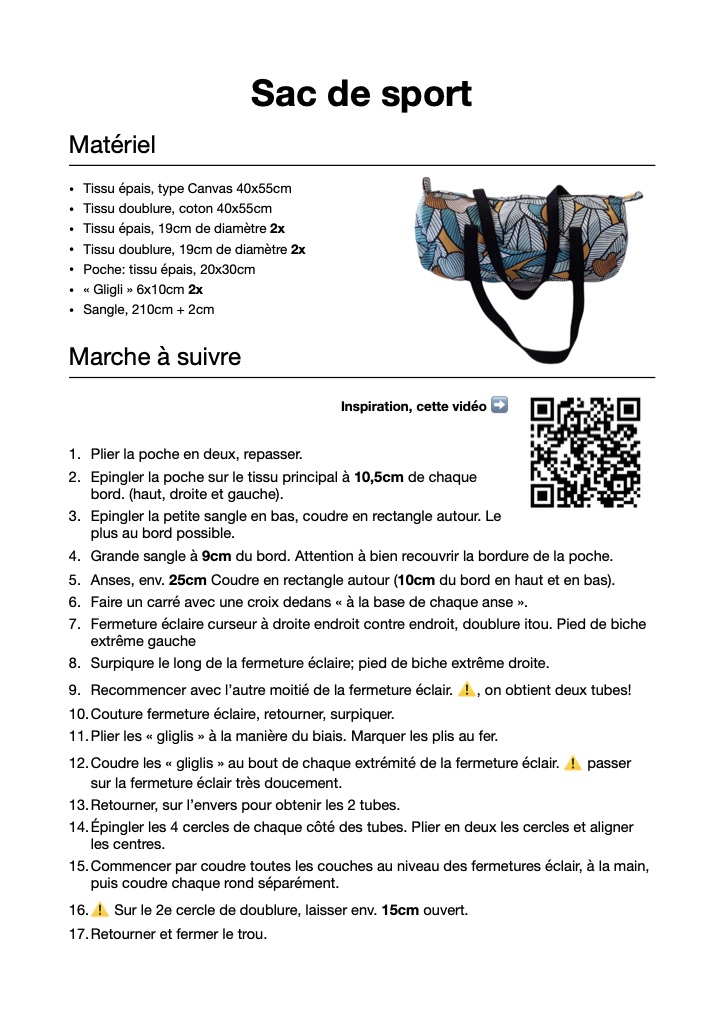 Ce sac est un mélange de plusieurs tutos et vidéos que j'ai trouvés, mais majoritairement inspiré de la vidéo que vous trouverez grâce au QR code sur le document. Ce document est mon document pour me remémorer les étapes, ce n'est pas pour que les élèves soient autonomes. Ce qui rend ce document clair pour moi, mais pour autrui? Donc si c'est incompréhensible désolée, si en revanche quelqu'un y trouve son compte, alors tant mieux!