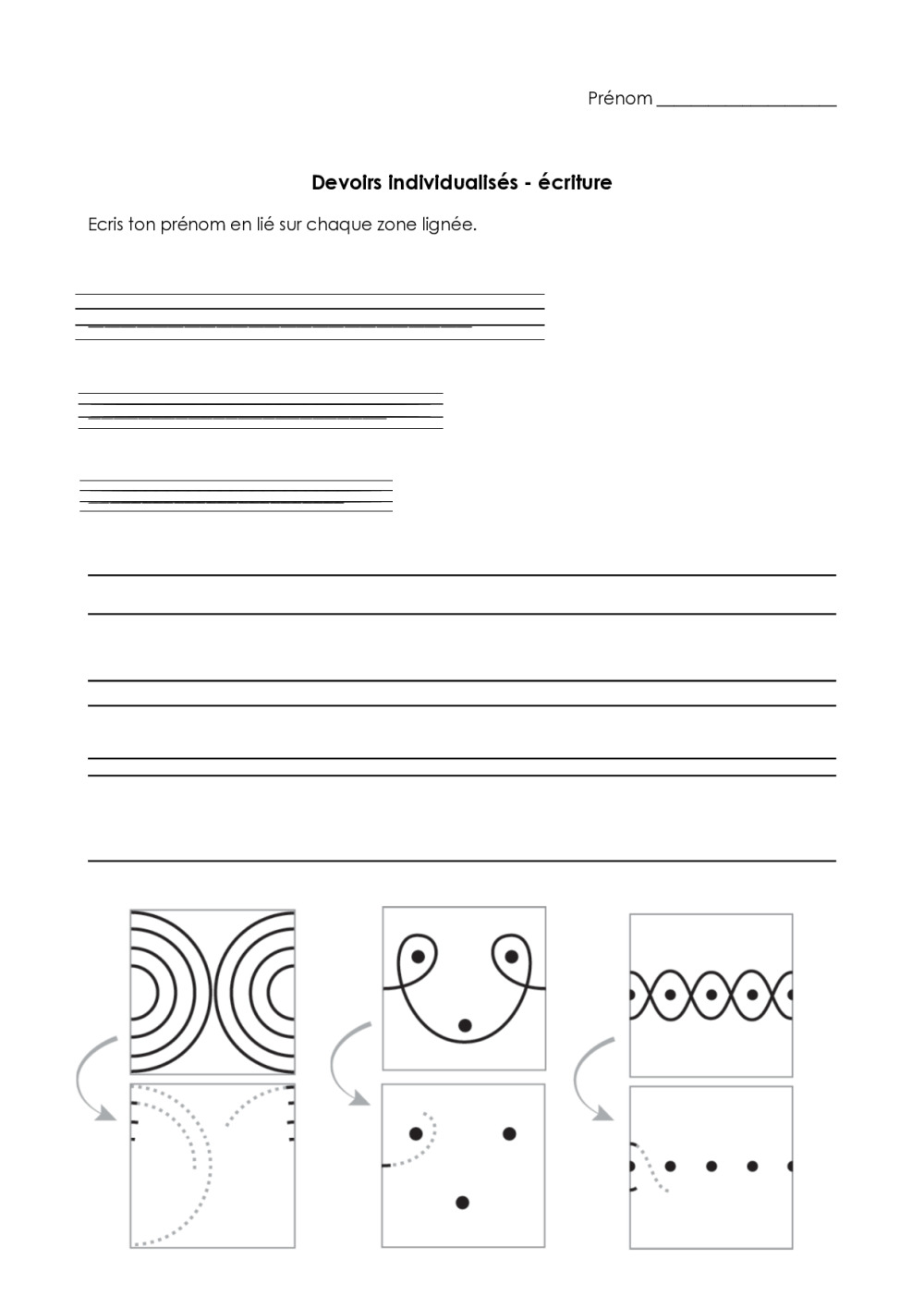 27 pages 22 prénoms par ordre alphabétique. Après l'exercice au tableau noir, les élèves (prennent 1 fiche), passent par dessus les modèles (au stylo feutre), et reproduisent le prénom du jour.