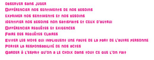 La communication non violente est basée sur les principes suivants, que même les enfants peuvent comprendre et appliquer quand on leur explique avec des mots et des situations simples :