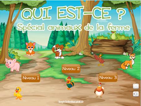 Pour les 3H, un Qui-est-ce? sur le thème des animaux de la ferme. Les élèves doivent pouvoir lire le descriptif de l'animal pour l'identifier: 2 options, choix direct ou élimination des mauvais candidats. Le jeu propose 3 niveaux, dont le 3e semble relativement inacessible à cet âge (références culturelles élaborées). Chaque niveau offre un choix de 10 animaux à identifier.