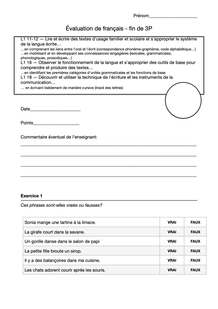 Evaluation significative de français en lien avec le livre : "Mes premiers pas en lecture" p8 à p38