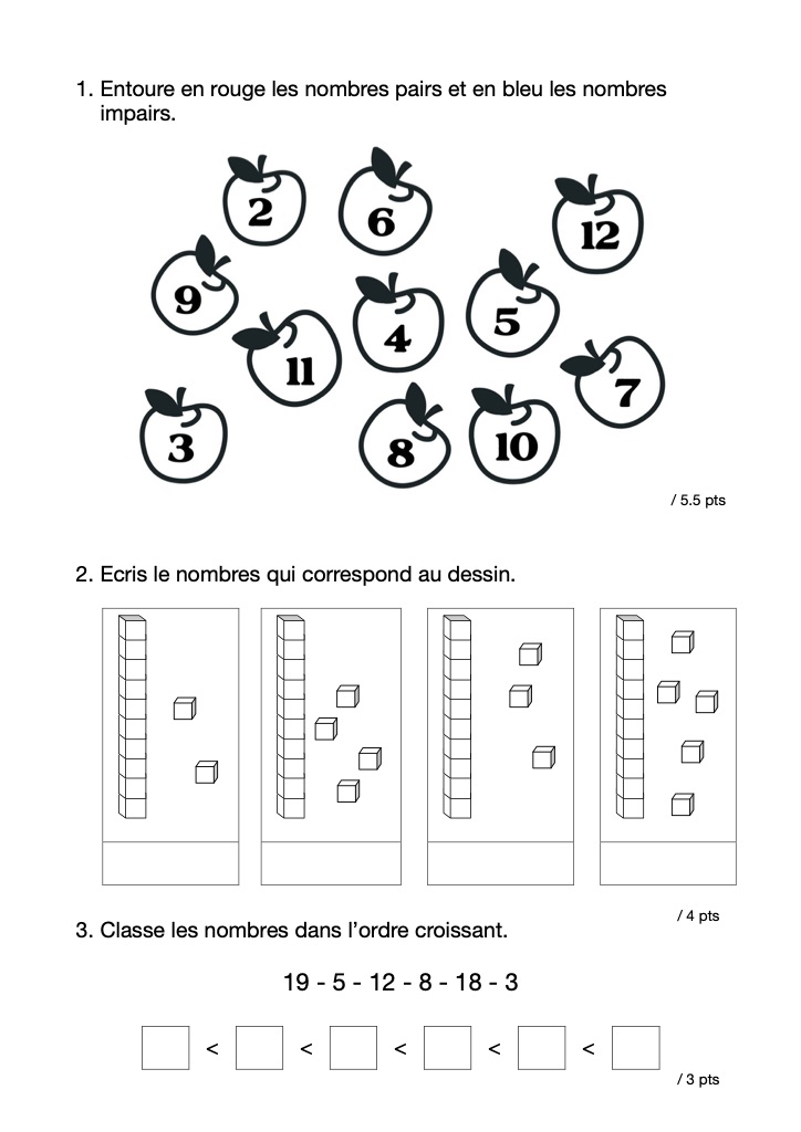 Proposition d'évaluation de mathématiques : les nombres jusqu'à 20