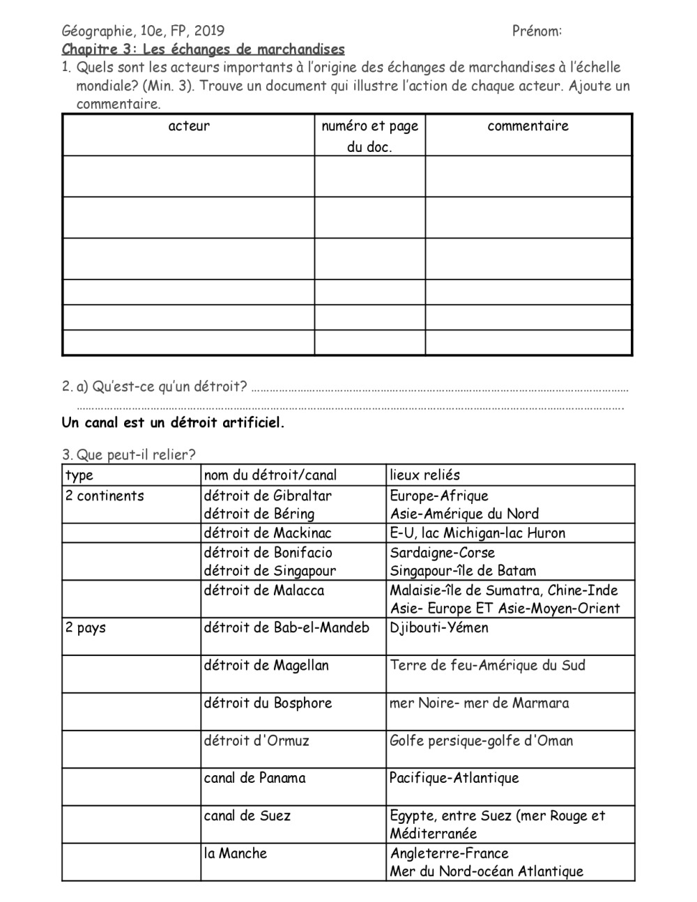Fiches et corrigé sur les acteurs des échanges de marchandise, les principaux détroits et canaux, ... En rapport avec le chapitre 3 de 10e. Et sites intéressants.