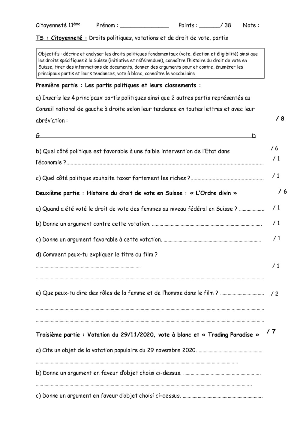 Fiche résumé sur les votations, initiative populaire, contre-projet, référendum, et questions sur le film "L'Ordre Divin". Utilisable pour chaque votation. Fiche votations du 27.09.2020 de King N. Fiche sur les votations (rts) Article sur projet 2019 Moudon Partis TS 2020
