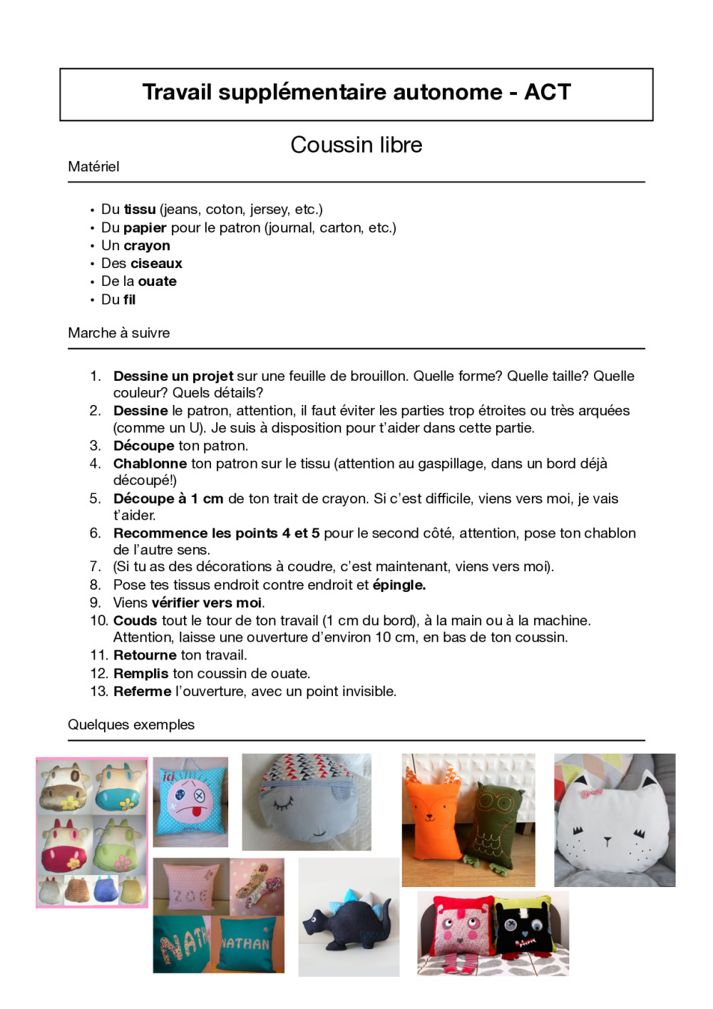 L'an prochain je me lance dans une nouvelle aventure, maîtresse ACT. Je crée en ce moment des MàS pour les élèves qui auraient tout terminé. Ceci est un premier jet, donc un retour est le bienvenu s'il y a des coquilles ou des éléments peu clairs. Thème: coussin libre