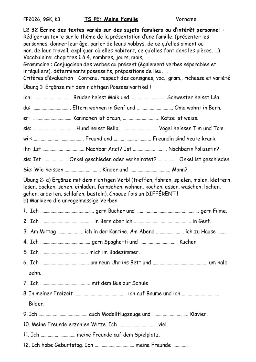 Résumé de grammaire des chapitres 1-3 de GenialKlick 9e. Place du verbe, Conjugaison présent, pronoms, déterminants possessifs, prépositions et cas.
