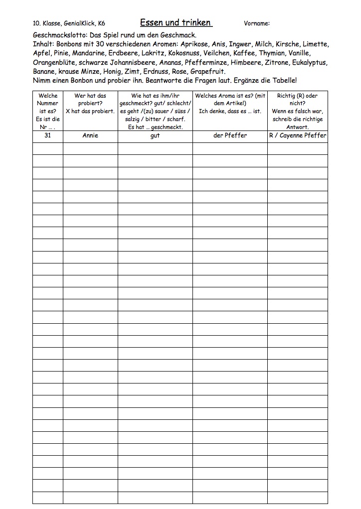 Fiche d'exercice ayant pour support le jeu (Geschmackslotto). Lire les aliments mais demander oralement les déterminants. Faire goûter 1 bonbon à chaque élève, (l'enseignant dit le numéro en donnant le bonbon car le nom est écrit sous la boîte) et leur demander les questions dans les cases. Les (...)