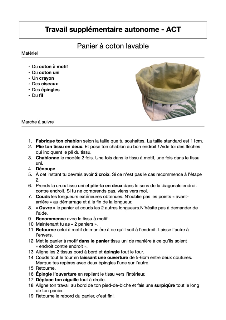 Paniers pour cotons lavables Marche à suivre pour travail autonome supplémentaire pour occuper les plus à l'aise.